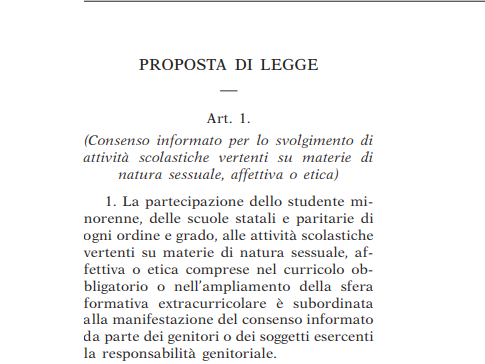 Questo principio serve a impedire al legislatore di usare un martello pneumatico per rompere una nocciolina. Anche se l’obiettivo di una legge è legittimo (per inciso: in questo caso si dovrebbe davvero tutelare il proprio figlio da tematiche ormai riconosciute e meritevoli di approfondimento, come la cultura gender? Per piacere…), lo strumento usato per raggiungerlo non deve essere eccessivo. Secondo i critici, il divieto assoluto di attività didattiche sui temi della sessualità nella scuola secondaria di I grado è esattamente questo: uno strumento sproporzionato.